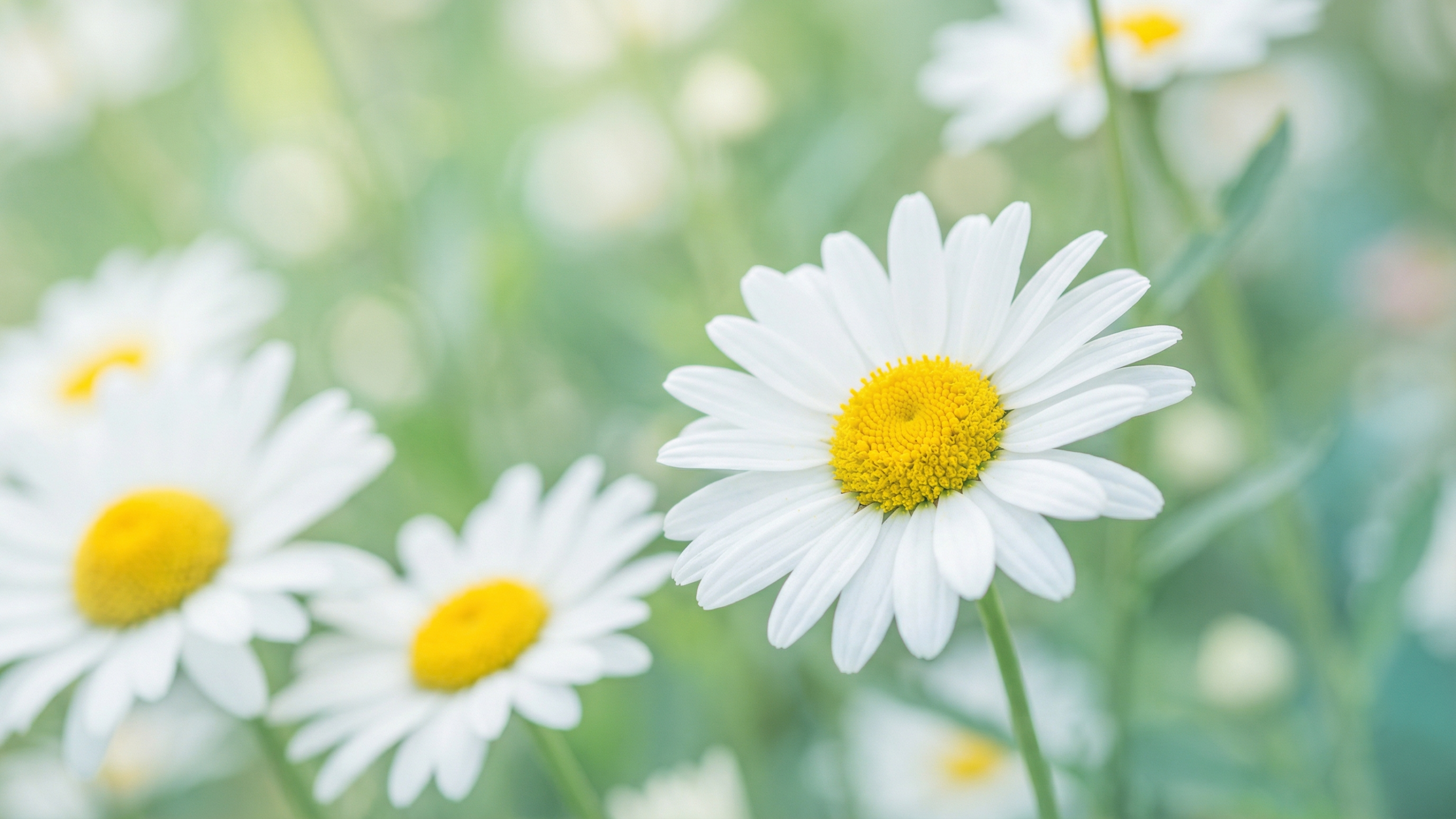 右側に大きく配置された白いデイジーを主役に、左手前に咲く花や明るいグリーンのボケが広がる、明度の高い爽やかな写真壁紙です。
