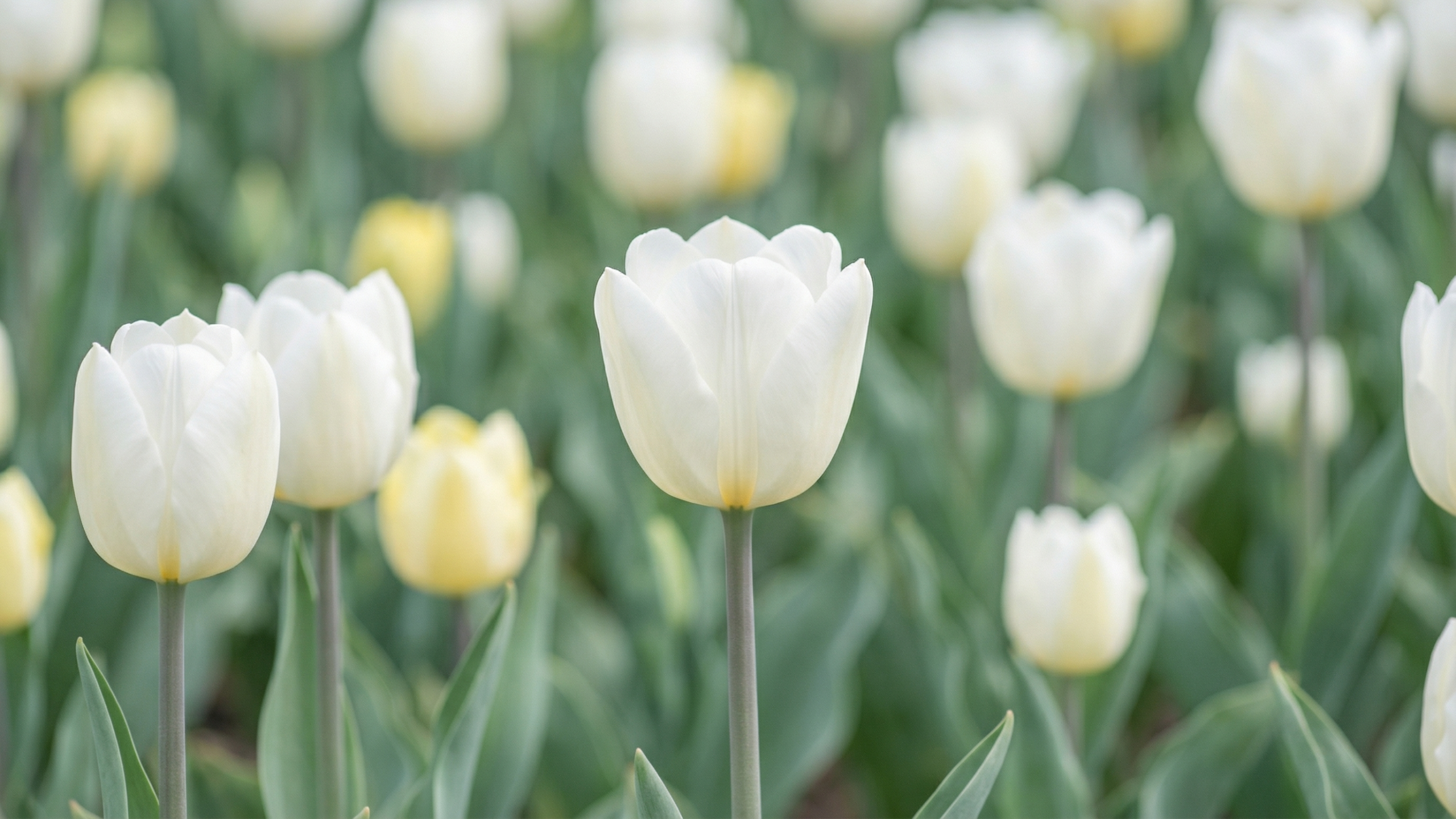 白と淡い黄色のチューリップが一面に咲き誇るチューリップ畑の写真壁紙です。