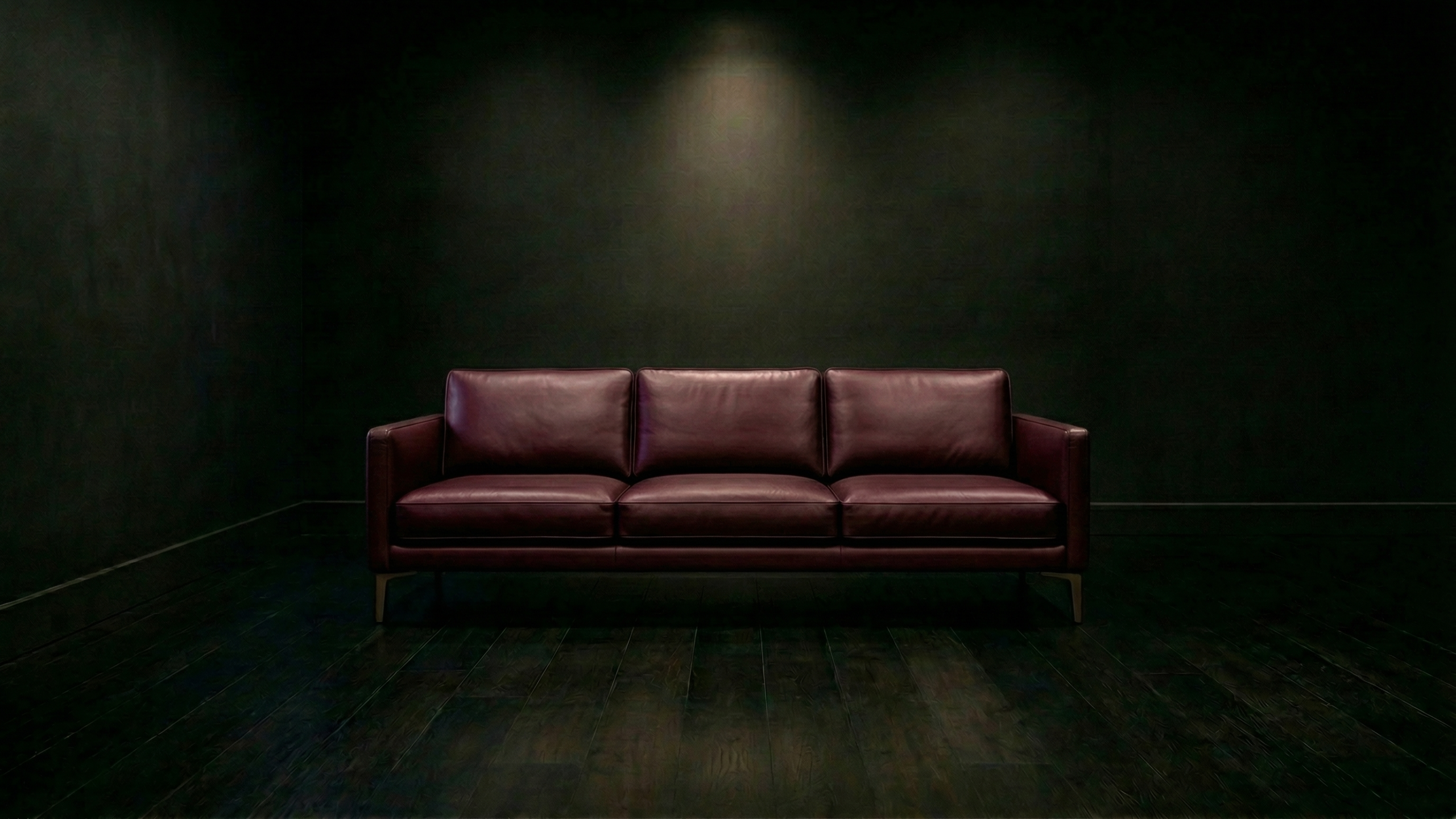暗闇に佇むワインレッドの3シーターレザーソファ PC壁紙 サンプルビュー