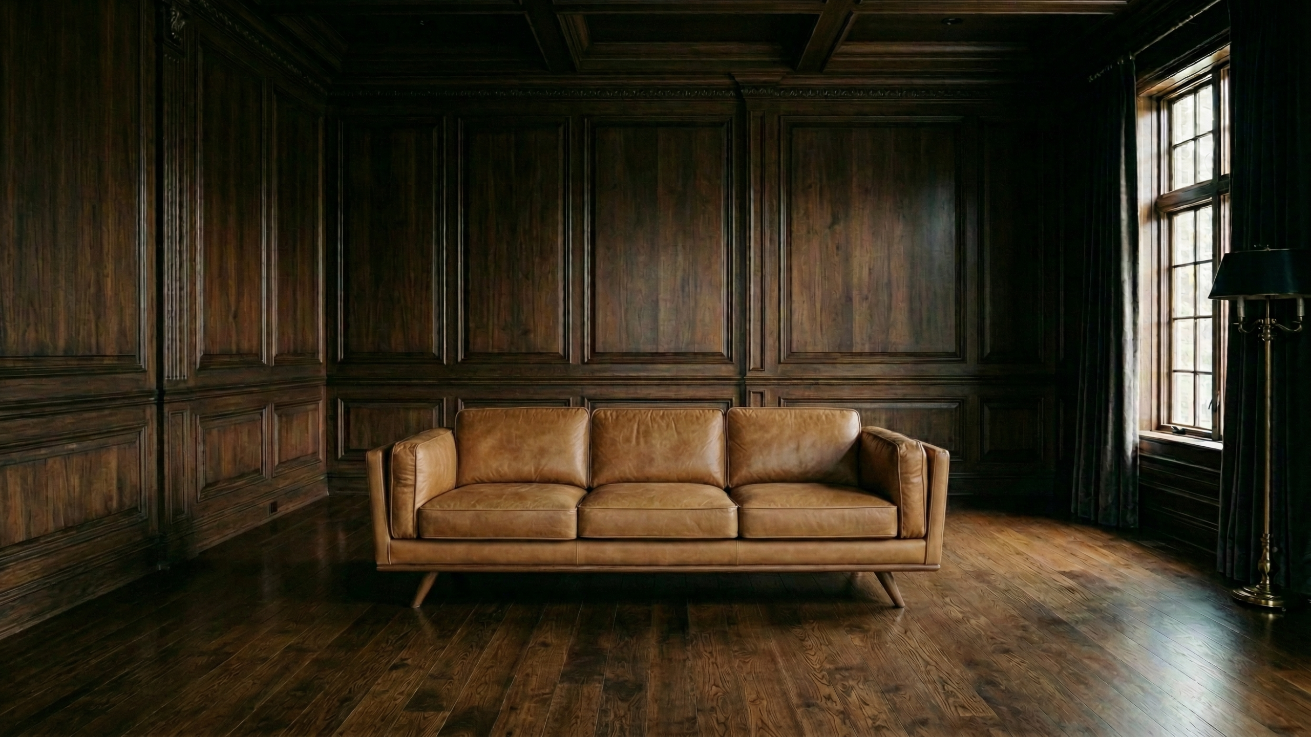 テーパードレッグが特徴的なミッドセンチュリースタイルのキャメルレザーソファの温かみのあるブラウンがダークウッドと絶妙に調和し、クラシックとナチュラルが融合した上品なデスクトップ背景として最適です。