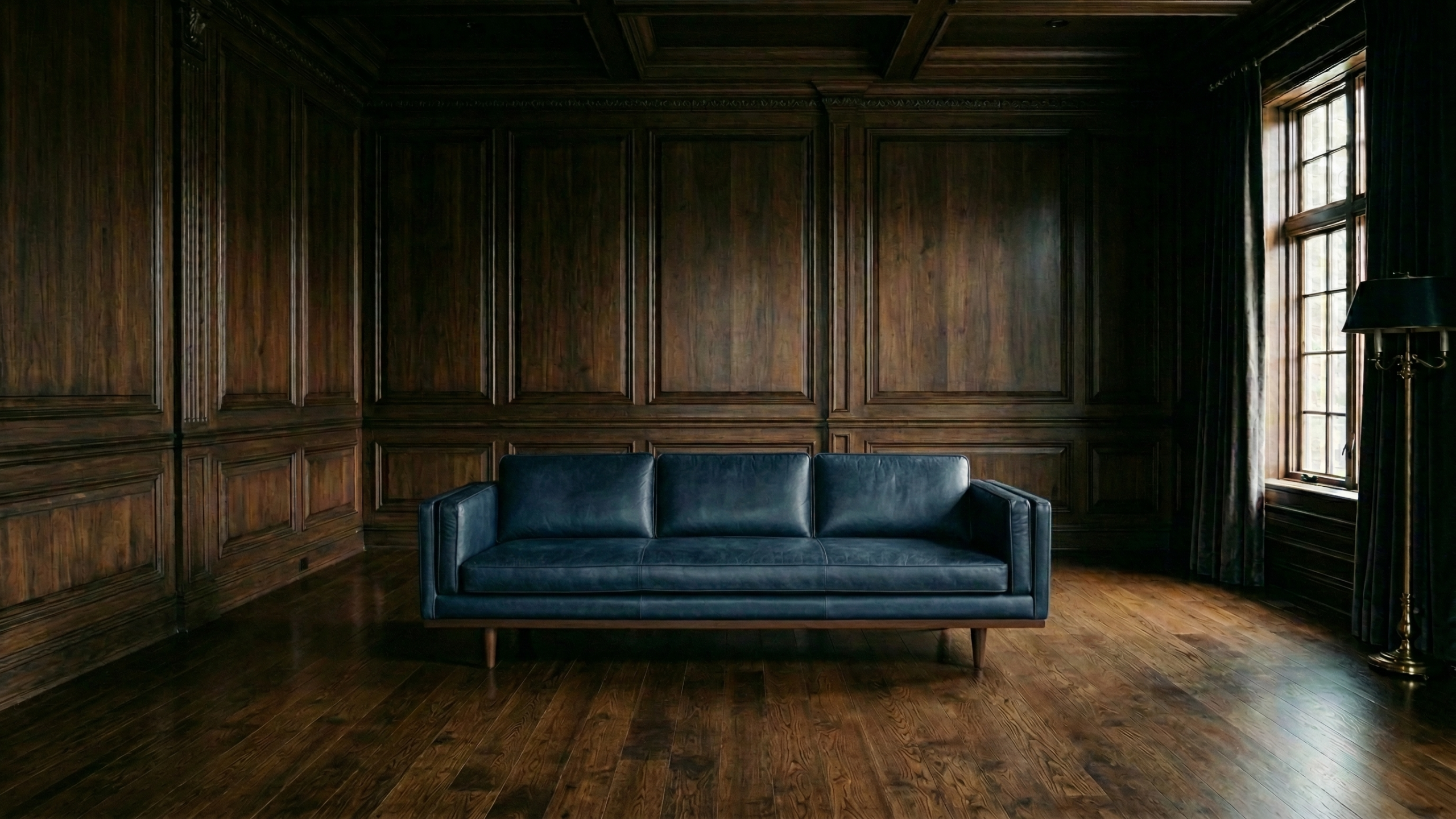 細身のテーパードレッグが特徴的なミッドセンチュリースタイルのネイビーレザーソファがダークウッドと美しく調和し、クラシックとモダンが融合した気品あるデスクトップ背景として最適です。