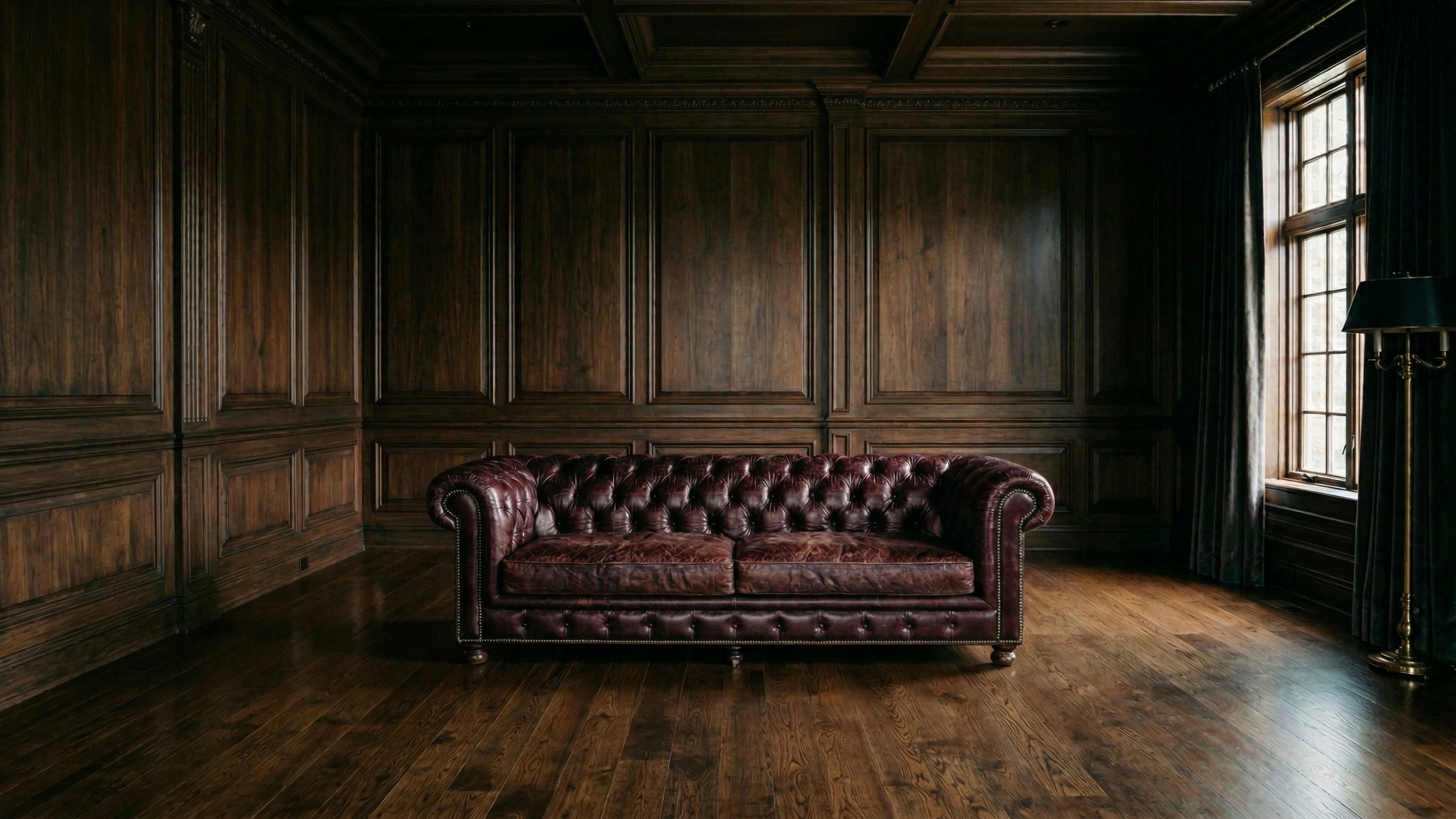 ウッドパネルの部屋とワインレッドのチェスターフィールドソファ PC壁紙 サンプルビュー